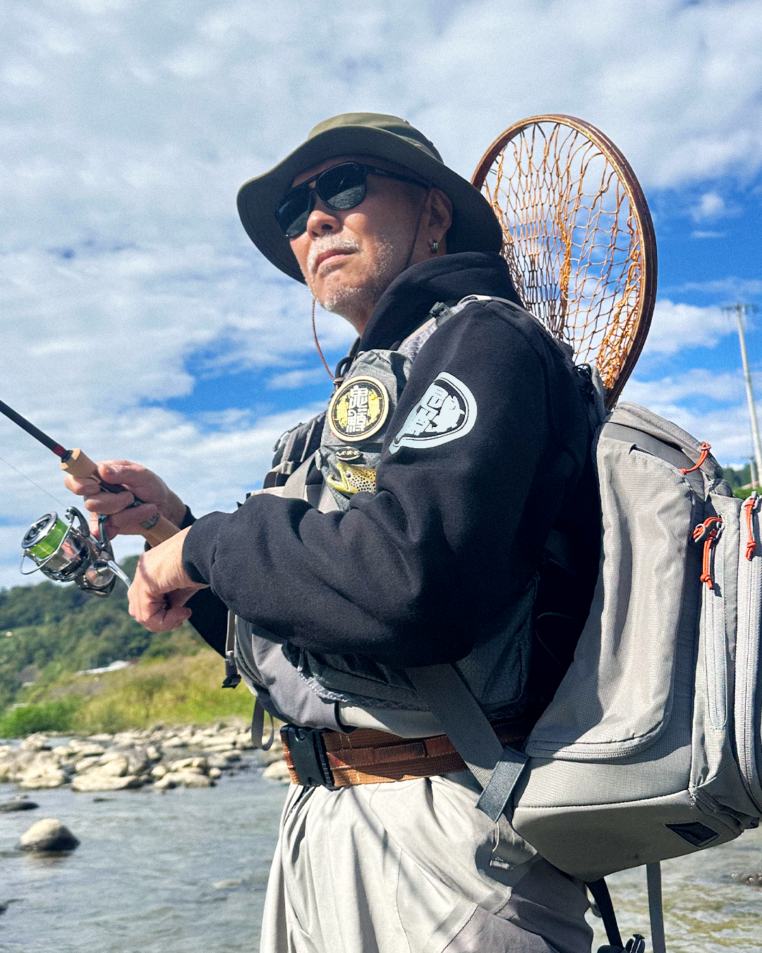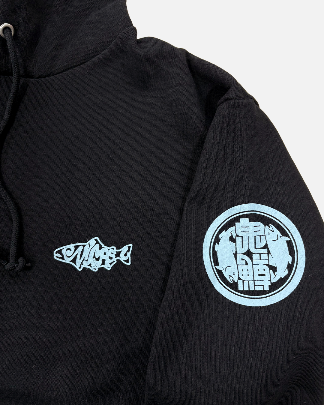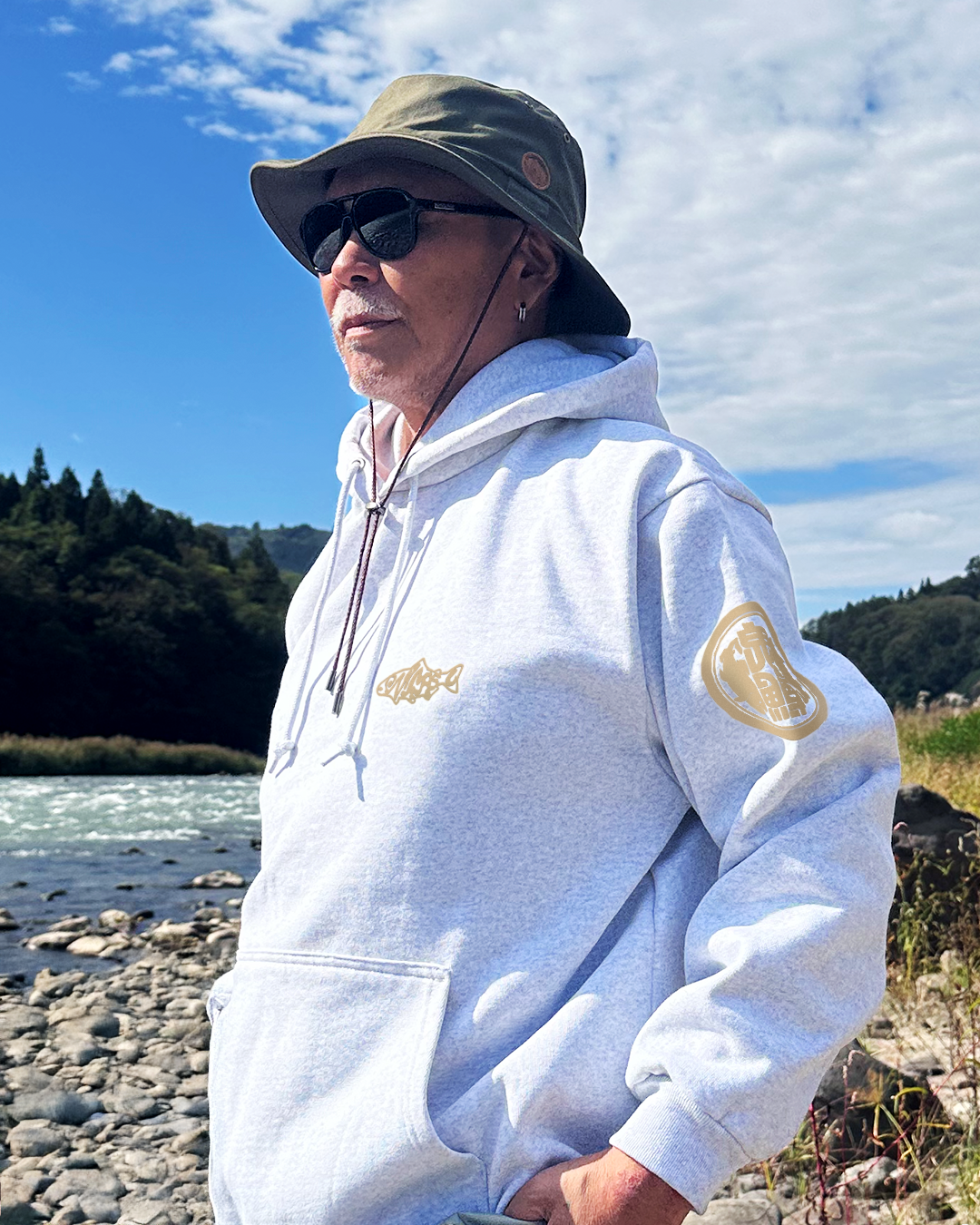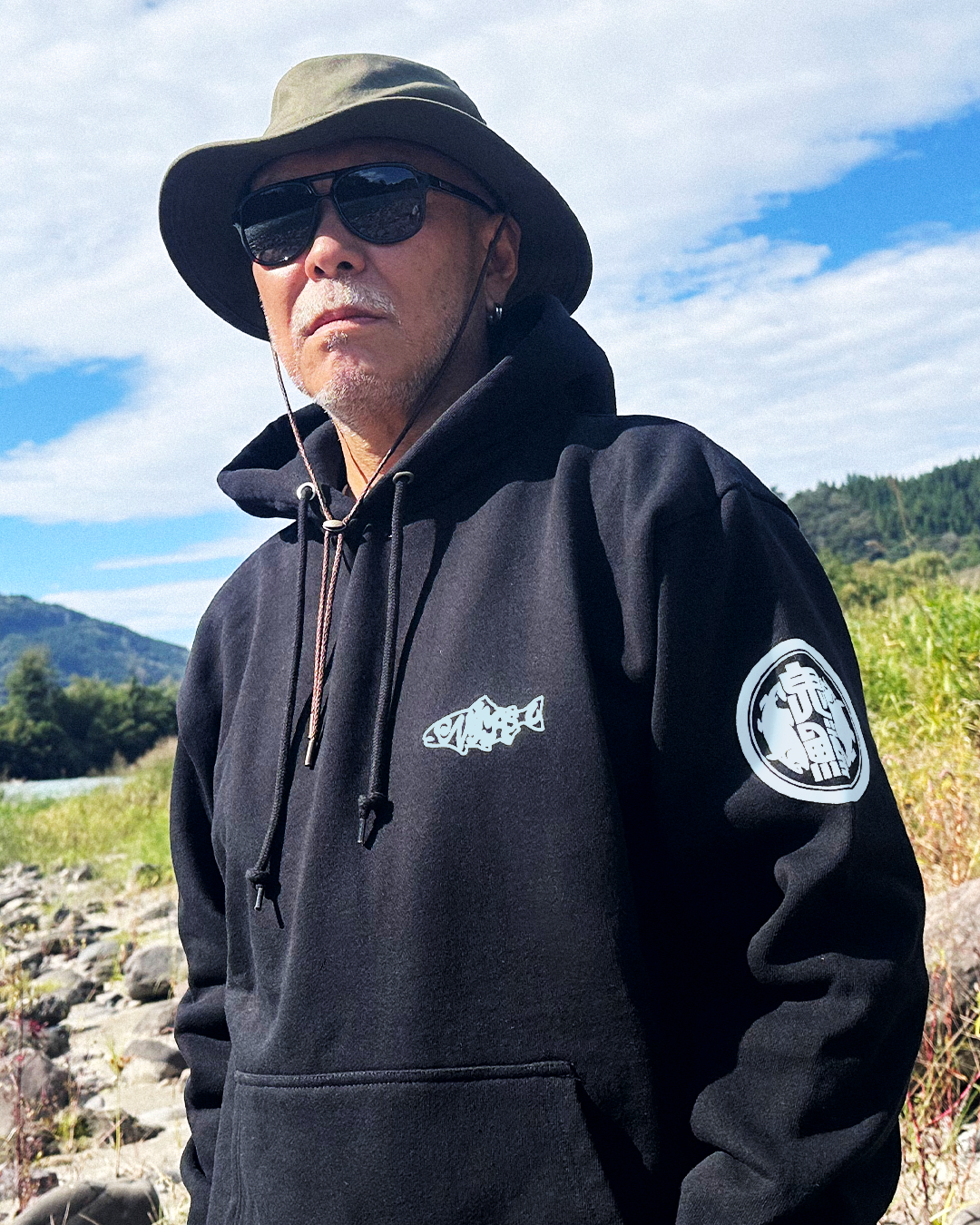 フーディーには鬼鱒ロゴと正影雅樹氏本人がデザインした鱒のモチーフロゴをプリントしました。