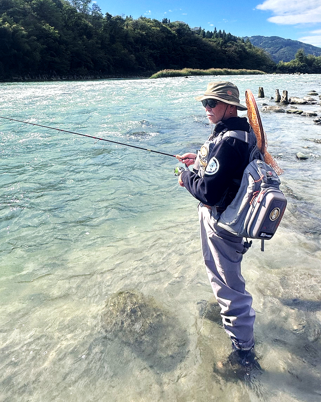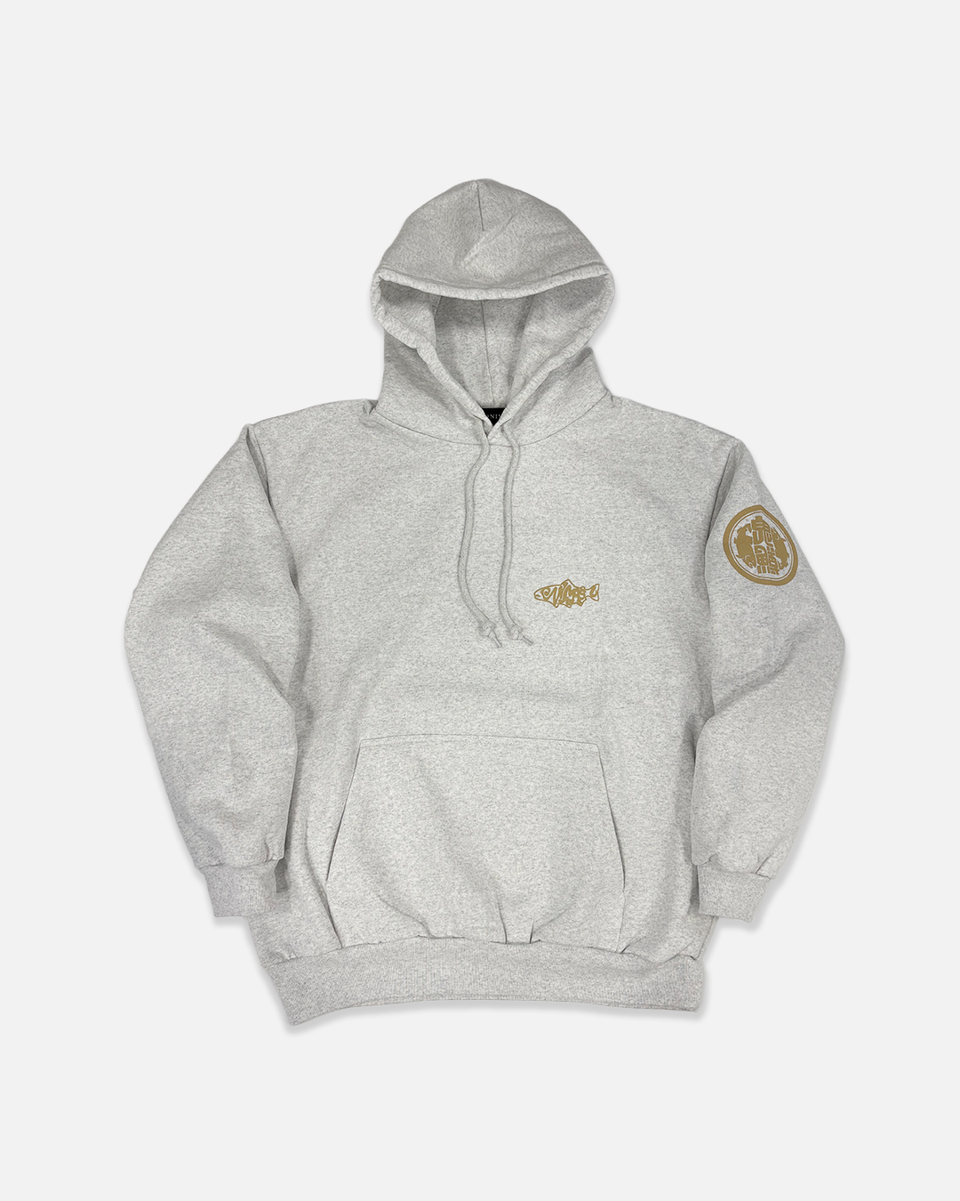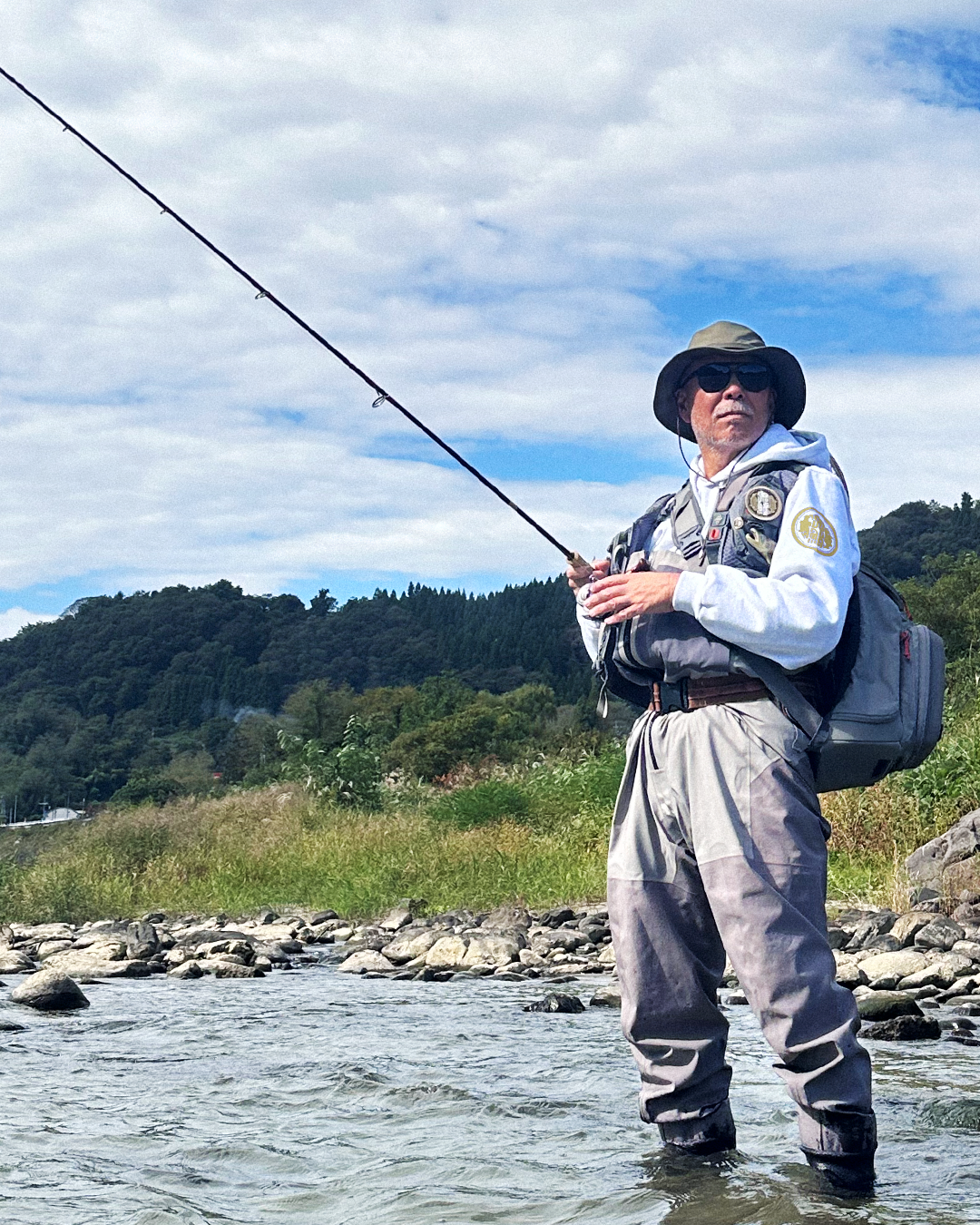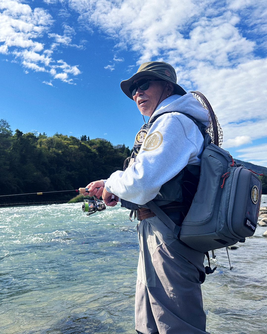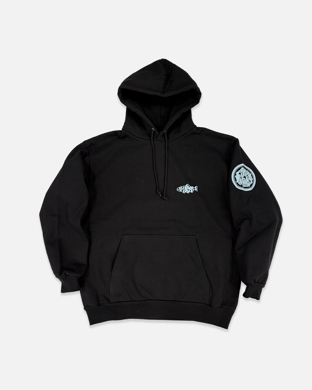 フーディーには鬼鱒ロゴと正影雅樹氏本人がデザインした鱒のモチーフロゴをプリントしました。